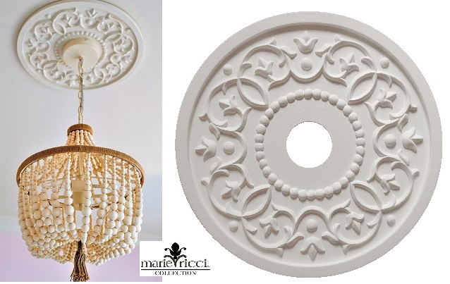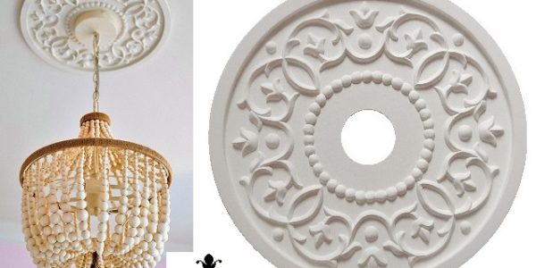 New Ceiling Medallion added to the Marie Ricci Collection. Flower Ceiling Medallion shown in solid white shown with a beautiful mirrored chandelier and a white traditional style chandelier. Ceiling Medallions are on the rise and our Handmade Collection are a perfect addition to any room, as shown here in a…