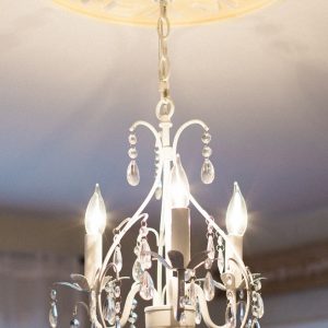 Children’s Chandelier. 3 arm Sadie Chandelier is 13″ wide by 16.5″ high, 18″ Chain. Pick your color to coordinate with one of our Ceiling Medallions. Shown in solid white with yellow distressed Sweet Dreams Ceiling Medallion, sold separately. Ships within three weeks. Bulbs not included.