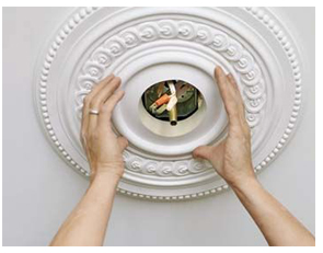 Once paint has dried, use a 1/4″ nylon brush and paint the background of the ceiling medallion. Repeat this process if necessary to achieve good coverage. Touch up white where needed for a less shabby chic look. Allow to dry and your ready for installation.