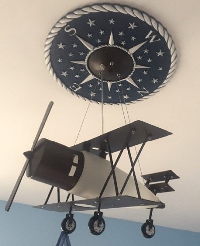 Star Monogram Ceiling Medallion. Shown in distressed powder blue or send me your one color. Benjamin Moore has perfect sample size jars and the ship directly to us. 18″ with 3.25″ opening for wires. Accepts 6″ max canopy. Ships within three weeks. Proudly Made in USA. Price Includes Shipping.